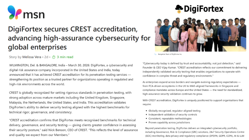 DigiFortex is a Cyber Security company focused on enhancing Security, Governance, Risk, Compliance (GRC) and Privacy postures for enterprises. Our flagship offerings are GRC, Advanced Penetration Testing(VA/PT), Cloud Security (CNAPP), Next-Gen Security Operation Center(SOC), MSSP, v-CISO and products for advanced Security Assessments.